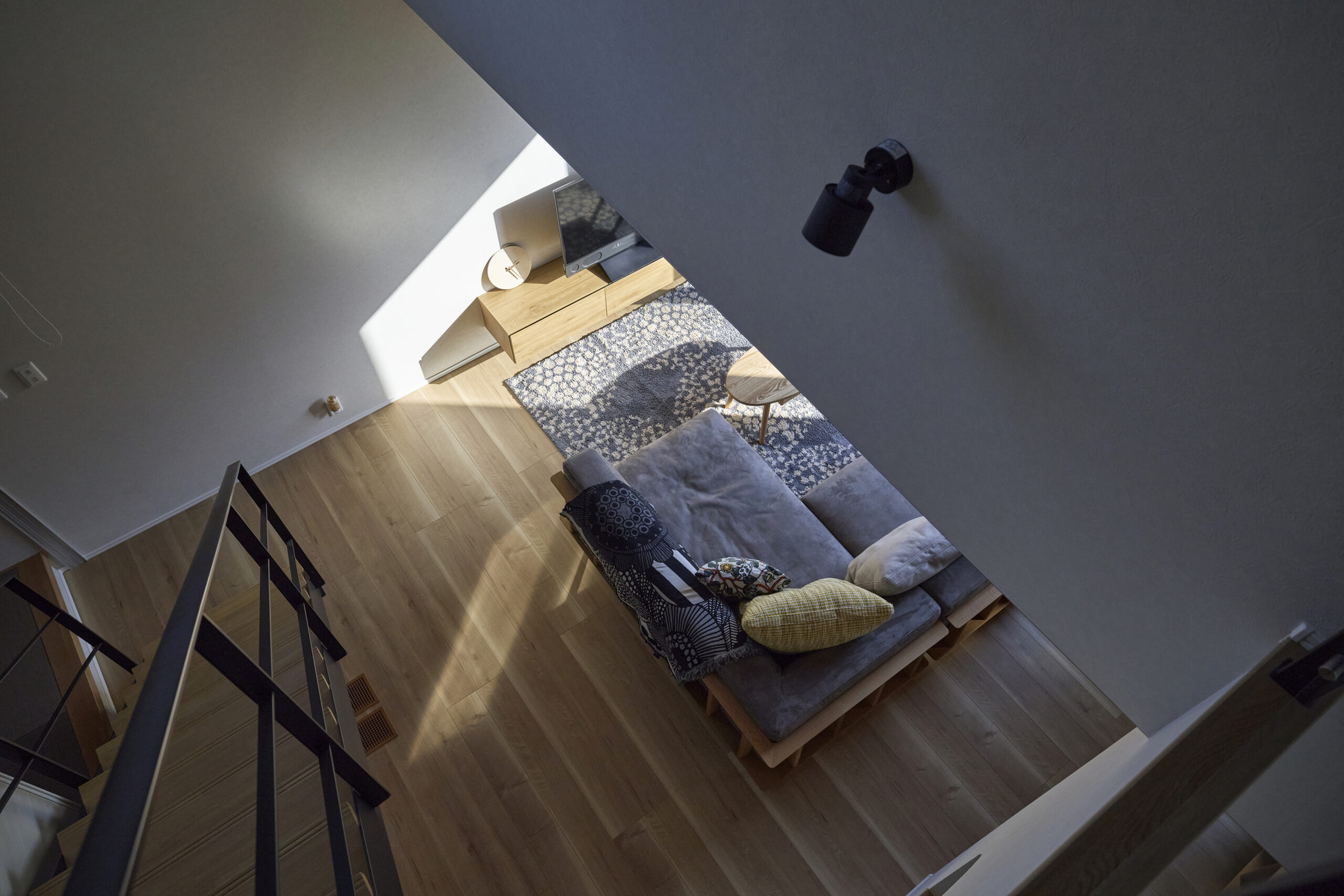 吹き抜けを通して光と家族の気配が巡る空間。