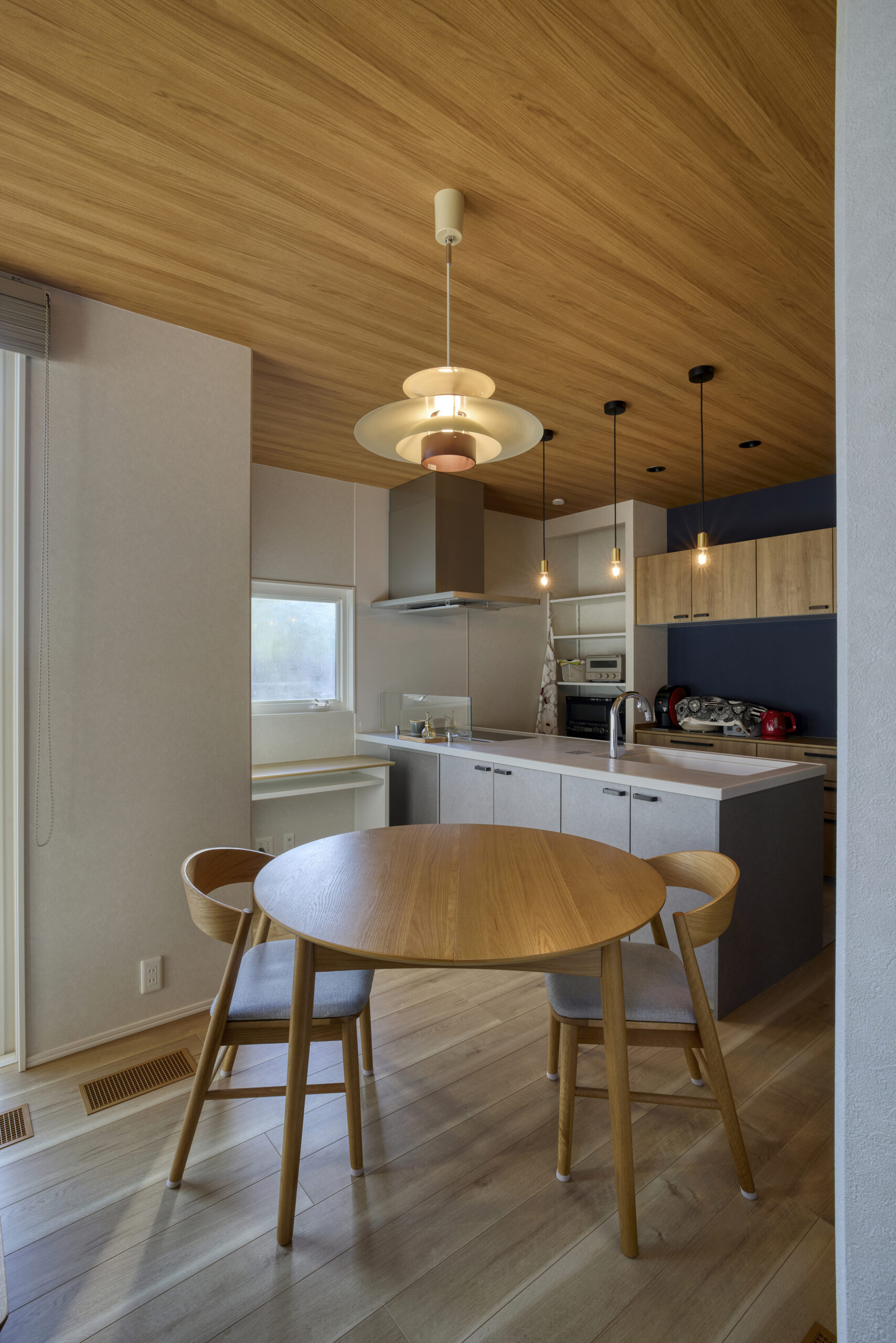 ペンダント照明のあかりと木のぬくもりに包まれる、夫婦の会話が弾むキッチン・ダイニング。