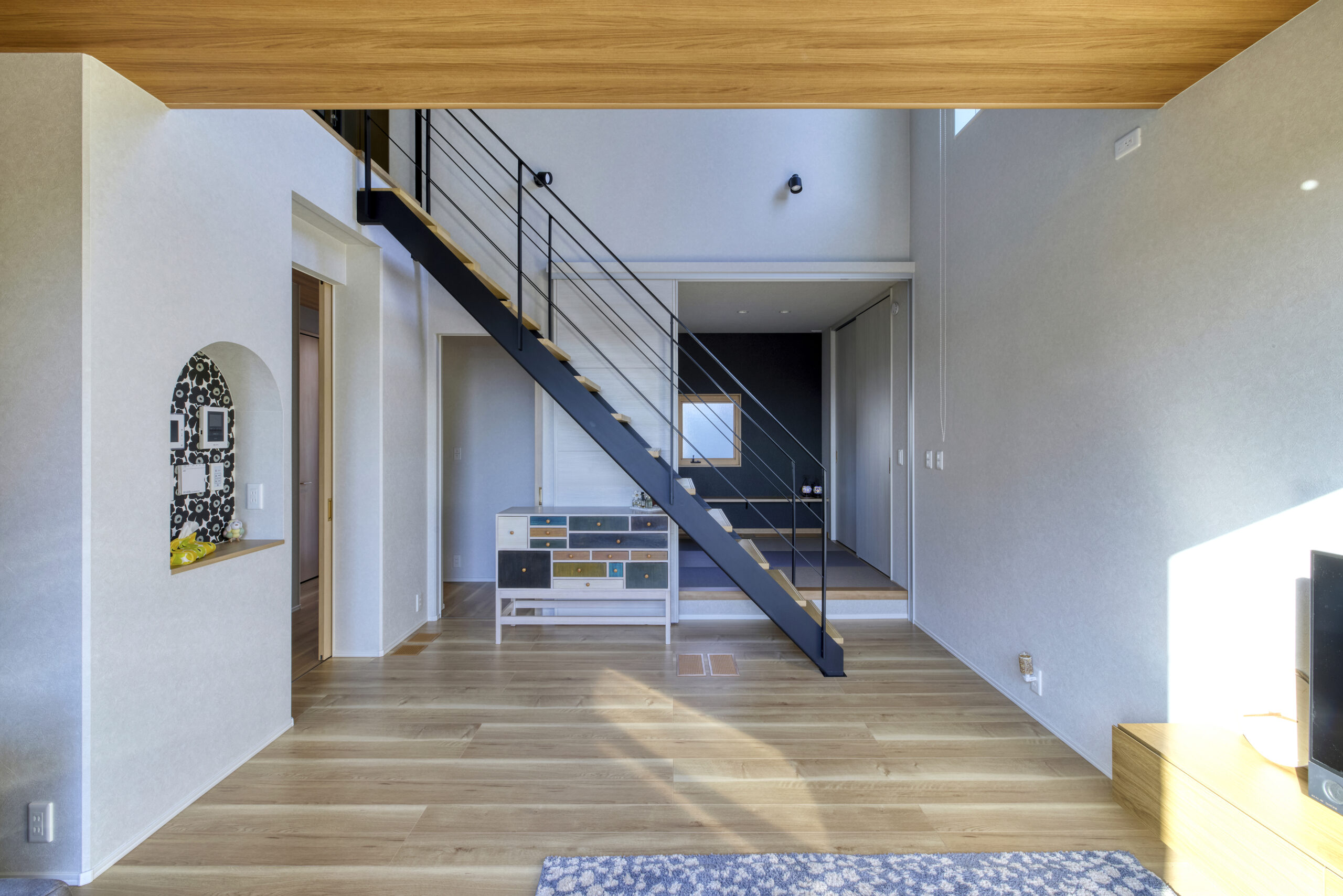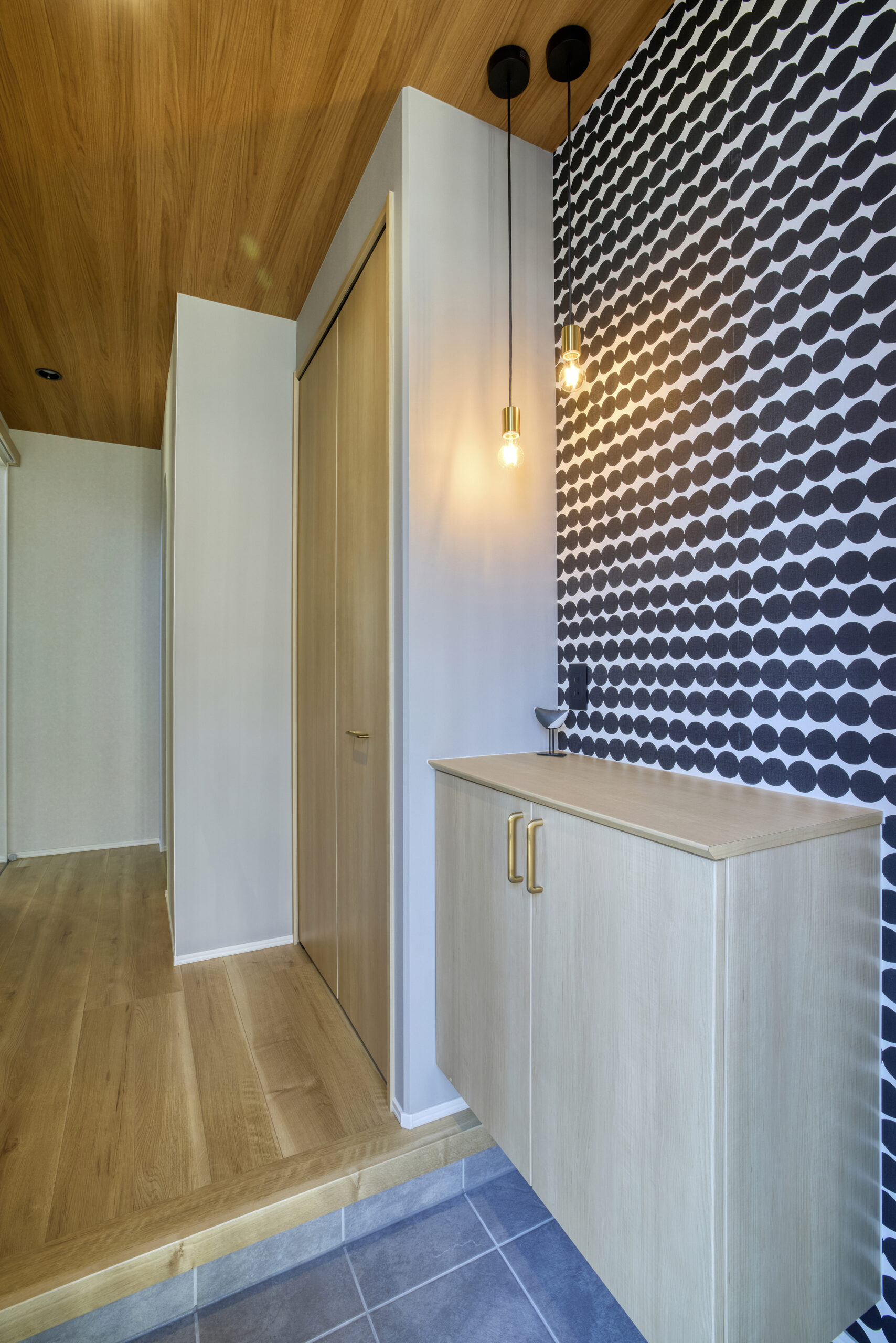 大胆なアクセントクロスと木目天井が融合した、個性が光るエントランス。温もりとモダンが調和。遊び心あふれる光の演出と玄関収納。