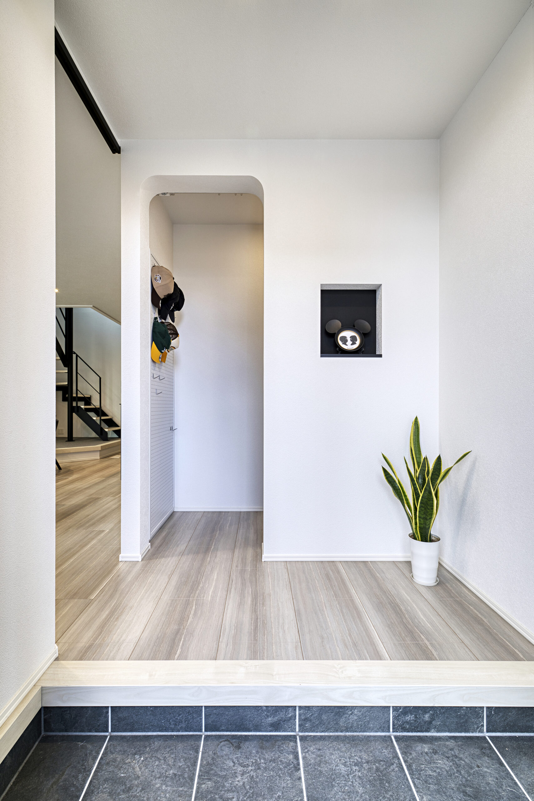 シンプルな壁面にこだわりぬいたアーチ型の通路で遊び心を添えた、上質な玄関。
