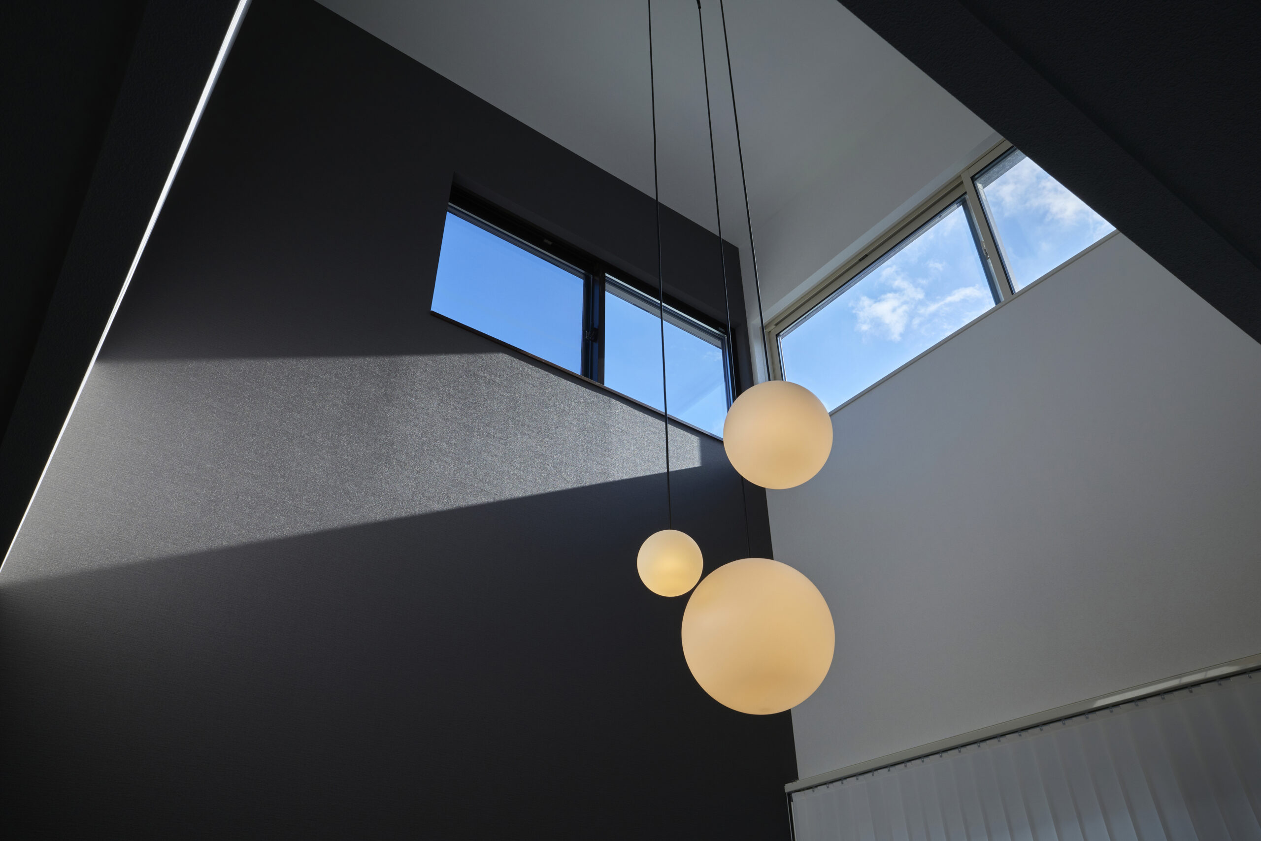 光と影のコントラストが美しい吹き抜け。アクセントウォールに映し出される光のコントラストが、空間にダイナミックな表情と立体感をプラスします。