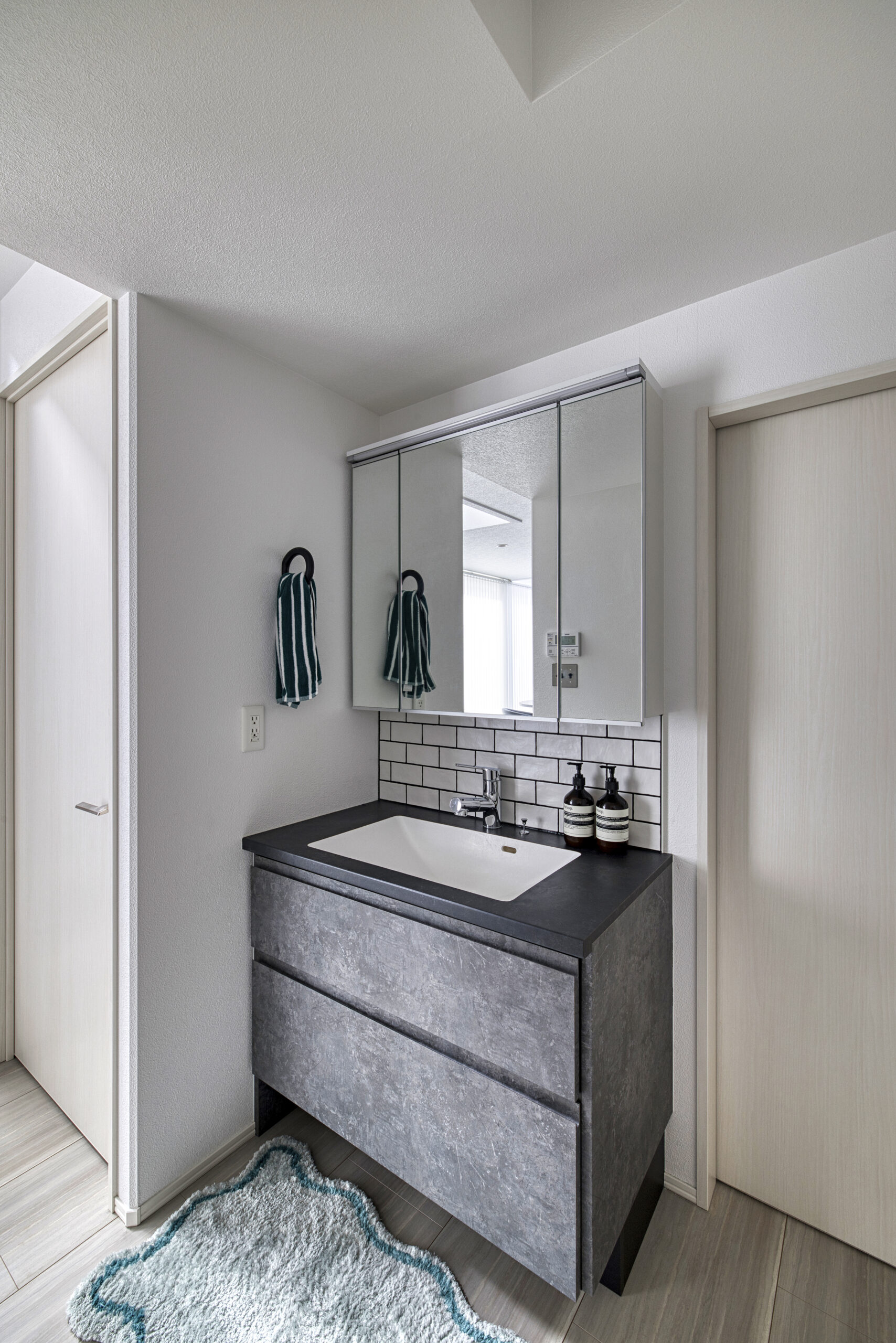 石目調の質感が空間を引き締める、洗練されたモダンな洗面台。
