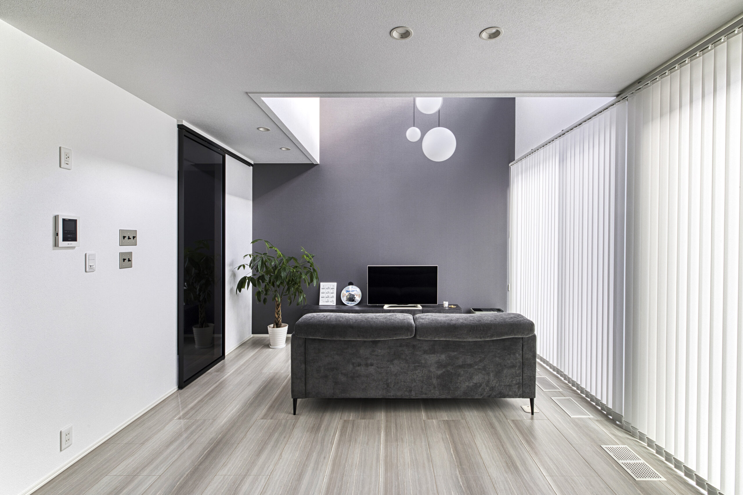 光と影が美しく交差する空間。モダンなインテリアに包まれる、家族の憩いの場。