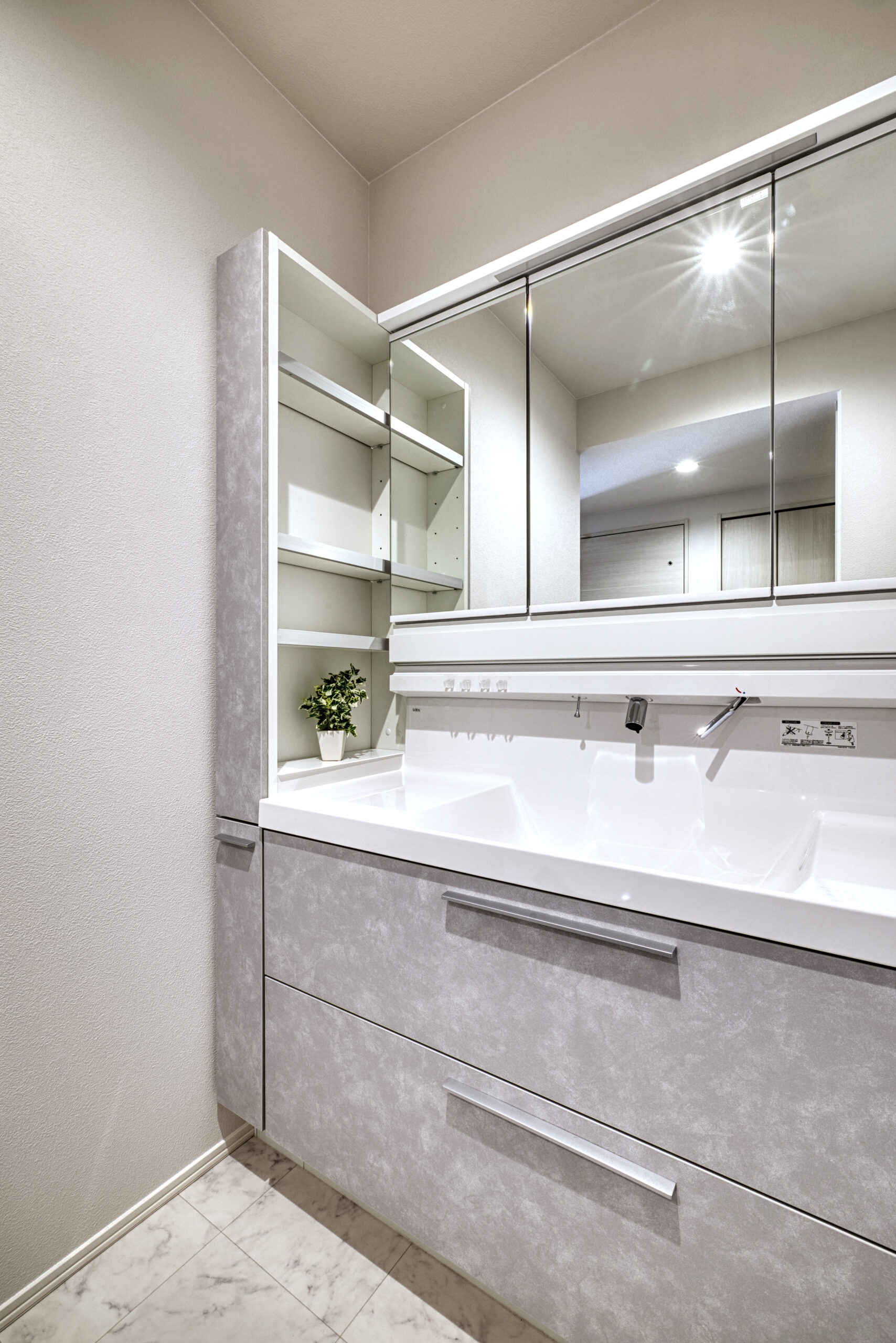石目調の面材が洗練された印象のゆとりある洗面。機能的な3面鏡がホテルライクな心地よさをもたらします 。