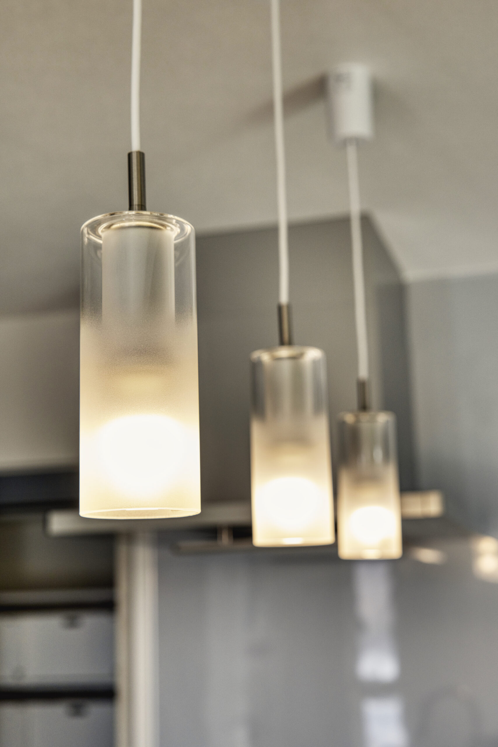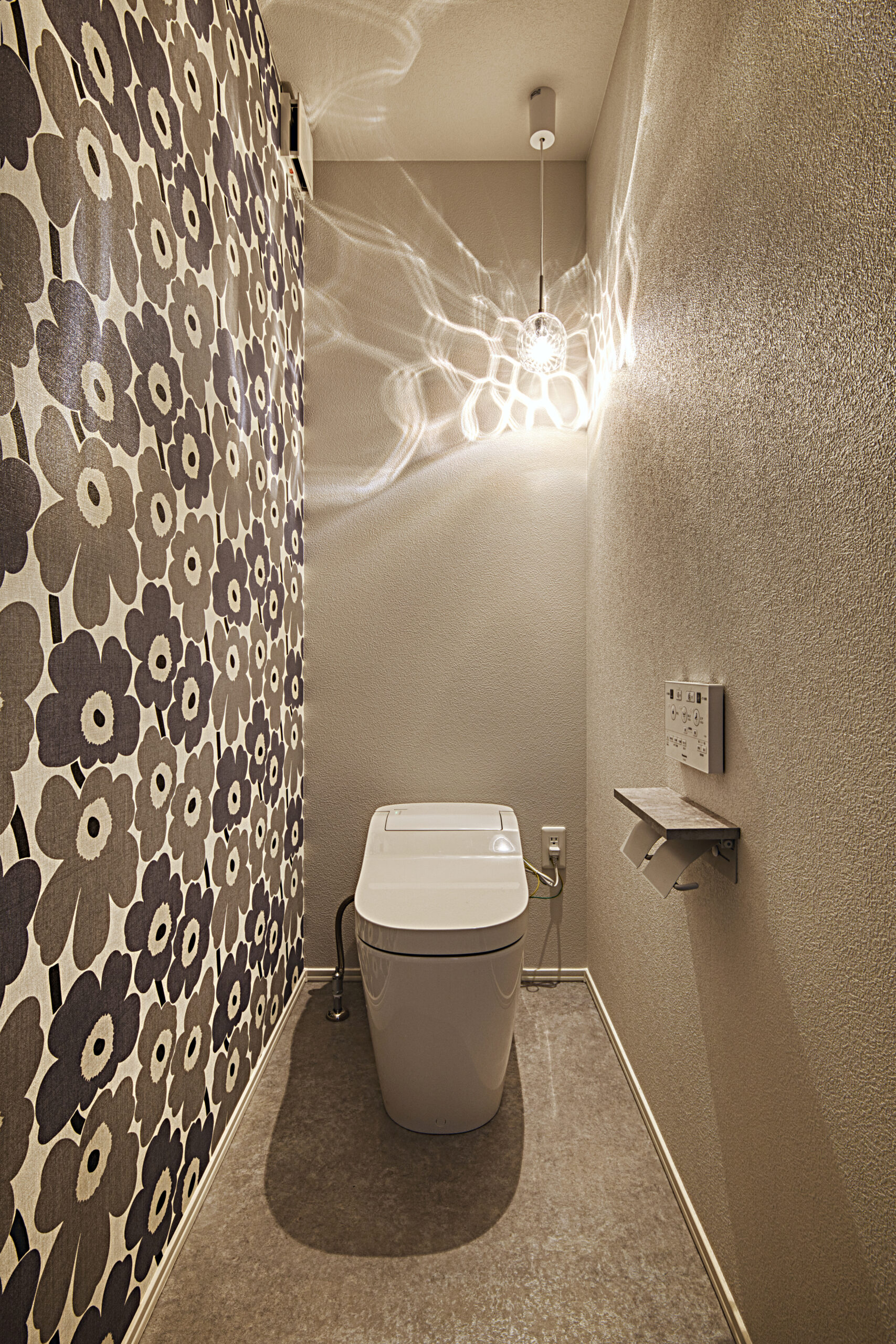 ペンダントライトから漏れる光の陰影が、北欧デザインのアクセントクロスに映し出され、幻想的な空間を演出。空間ごとに雰囲気を変えてグレートーンを楽しみます。