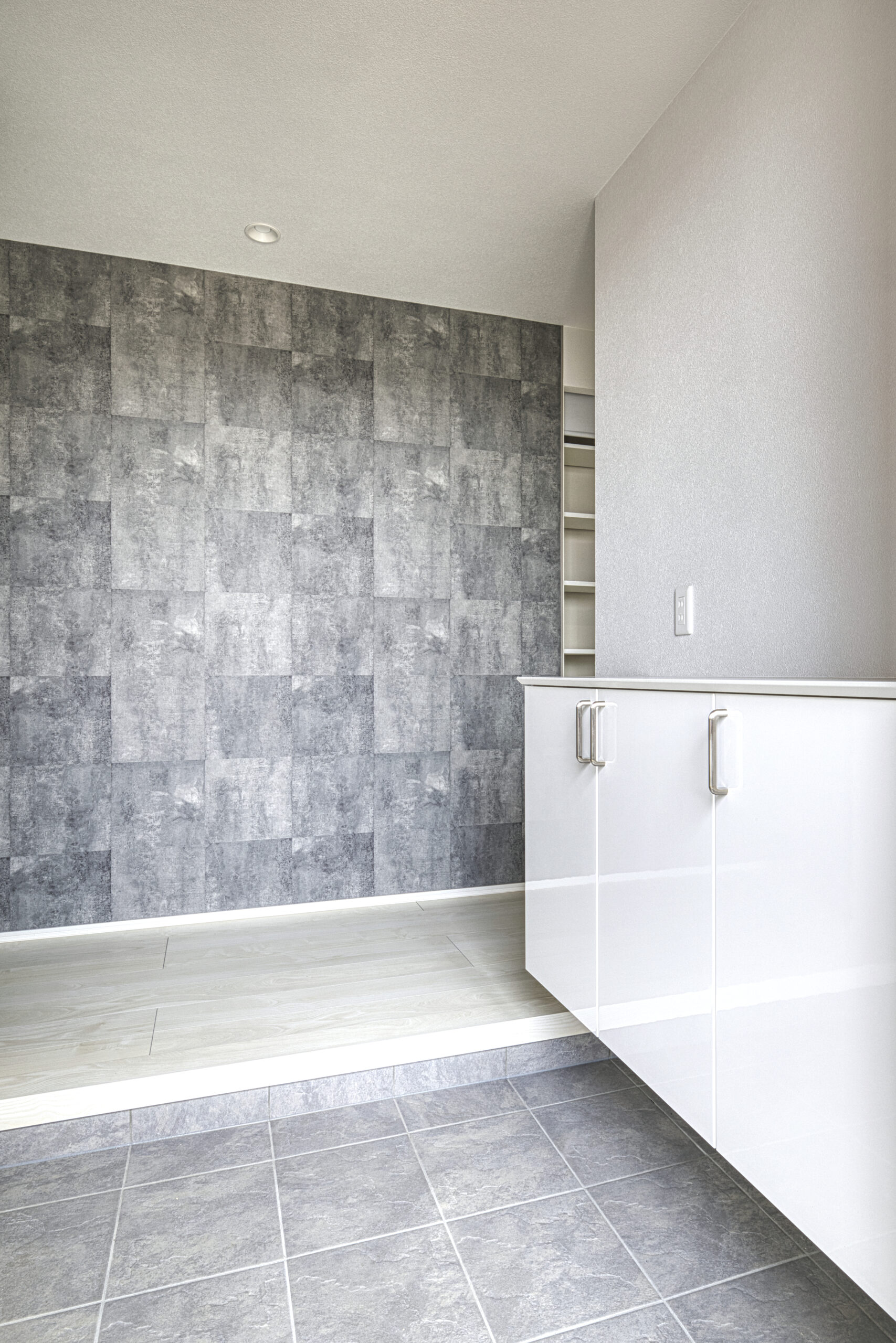 迫力のある、大きめの模様が入ったアクセントクロスが出迎えする玄関ホール。クーラーボックスやアウター類を見せずにしまえる玄関収納のおかげで、生活感を出さずドラマチックな空間を維持。
