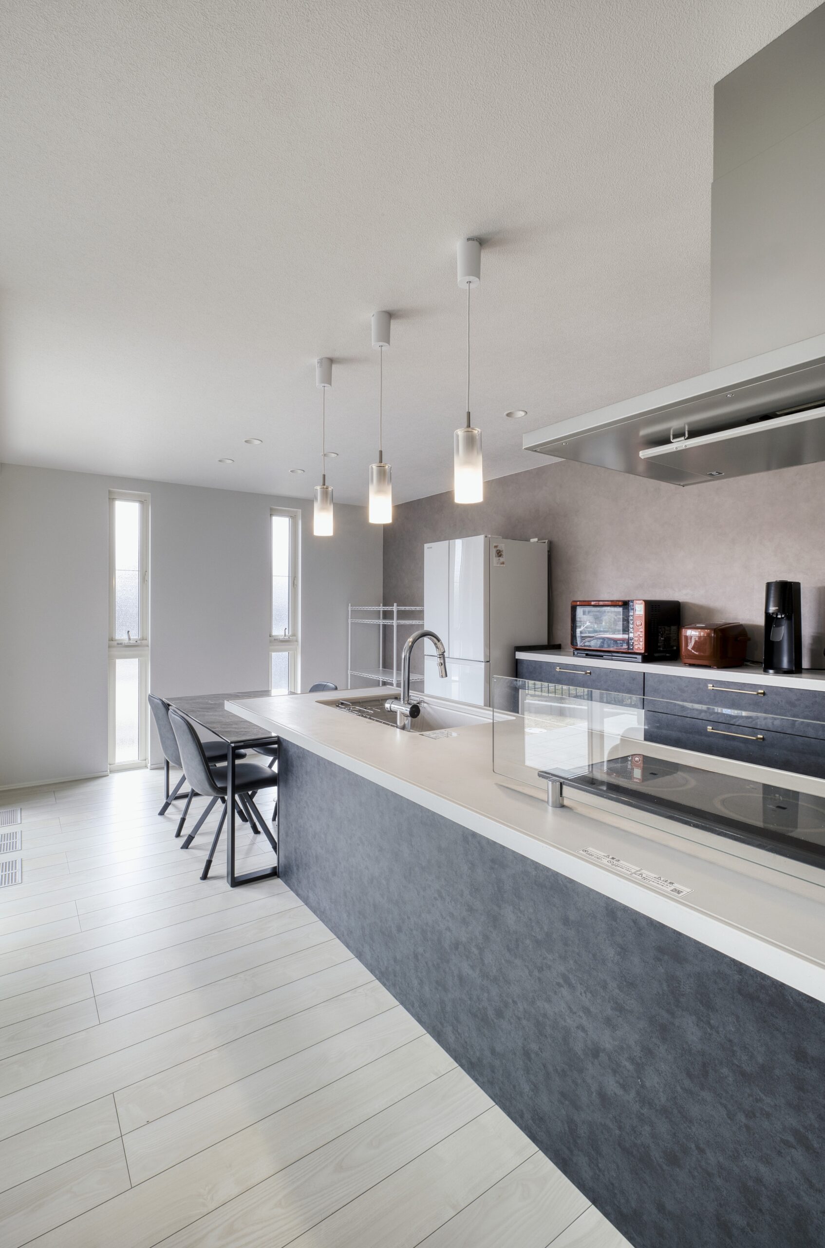 白を基調とした空間にダークトーンの面材が映えるキッチン。様々なトーンのグレーを使うことで、明るさもありながら少し落ち着いた雰囲気に。