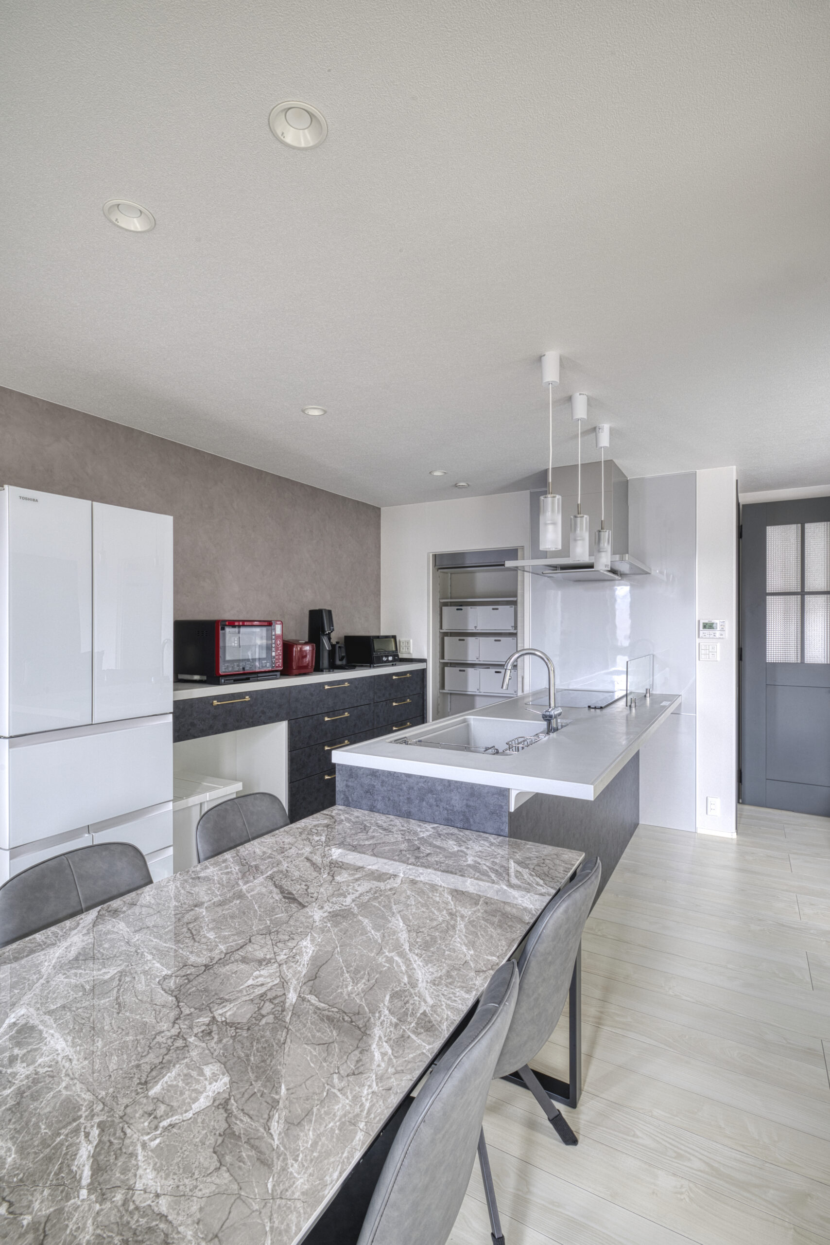 高級感漂う大理石調のダイニングテーブルが輝くダイニング。買い物から帰ってすぐに片付けられるパントリーを設け、片付けもスムーズに。