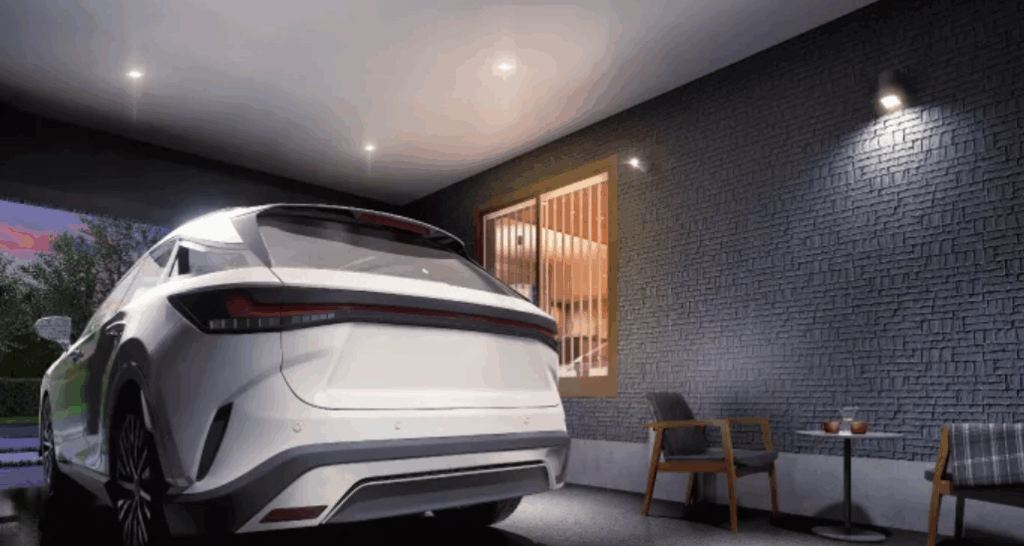 ガレージを単に明るくするだけでなく、スポットライトで愛車のボディラインを照らし主役として際立たせるなど、計画的なライティングで光と影を演出します。