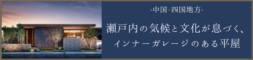 HeimD1 SETOUCHI G-Editionは、瀬戸内の気候や文化に寄り添いながら、インナーガレージのある平屋暮らしを提案する住まいです。