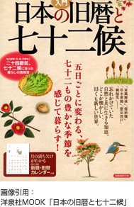 自然と生活が密着した旧暦の基本単位である七十二候(しちじゅうにこう)。約5日ごとの季節の変化を、細やかに表現する七十二候が、東日本大震災以降、注目を集めているそうです。昨年2月の出版以来、20万部を超えたのが「日本の七十二候を楽しむ」(東邦出版)。候に関連する詩歌や行事、野菜や魚介の挿絵とともに紹介されています。